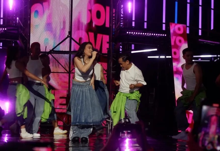 Agnez Mo Mucul dari atas menggunakan teknologi seperti lift yang disambut teriakan para fans dan para penonton.