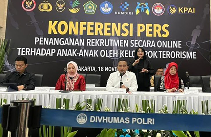 “Pada tahun ini, 2025, sekitar 110 anak teridentifikasi terpapar jaringan teror. Ini menunjukkan adanya proses rekrutmen yang sangat masif melalui media daring,” ujar Mayndra dalam jumpa pers di Mabes Polri, Jakarta Selatan, Selasa (18/11/2025).