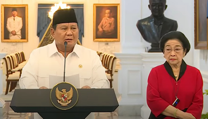 Di samping Presiden berdiri sosok yang selama ini dikenal penuh wibawa, Presiden ke-5 Republik Indonesia, Megawati Soekarnoputri. Dengan balutan busana merah menyala, Megawati berdiri persis di sisi Prabowo, menghadirkan pemandangan penuh makna.