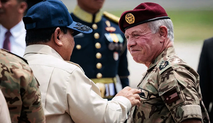 Raja Abdullah II tiba bersama Prabowo dan tampak mengenakan seragam militer, sementara Prabowo tampil dengan pakaian safari krem. Keduanya sempat berbincang singkat sebelum berjalan melewati pasukan jajar kehormatan yang telah bersiap menyambut.